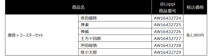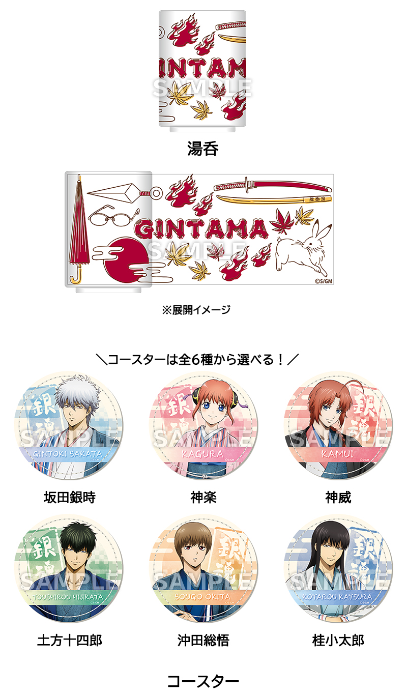 湯呑は1種類、コースターは「坂田銀時」「神楽」「神威」「土方十四郎」「沖田総悟」「桂小太郎」の全6種の中から好きなキャラクターを選ぶ仕組みとなっています。サイズ(約)は湯呑がH107×W74mm(満水時 約330cc)、コースターが直径90mm。
