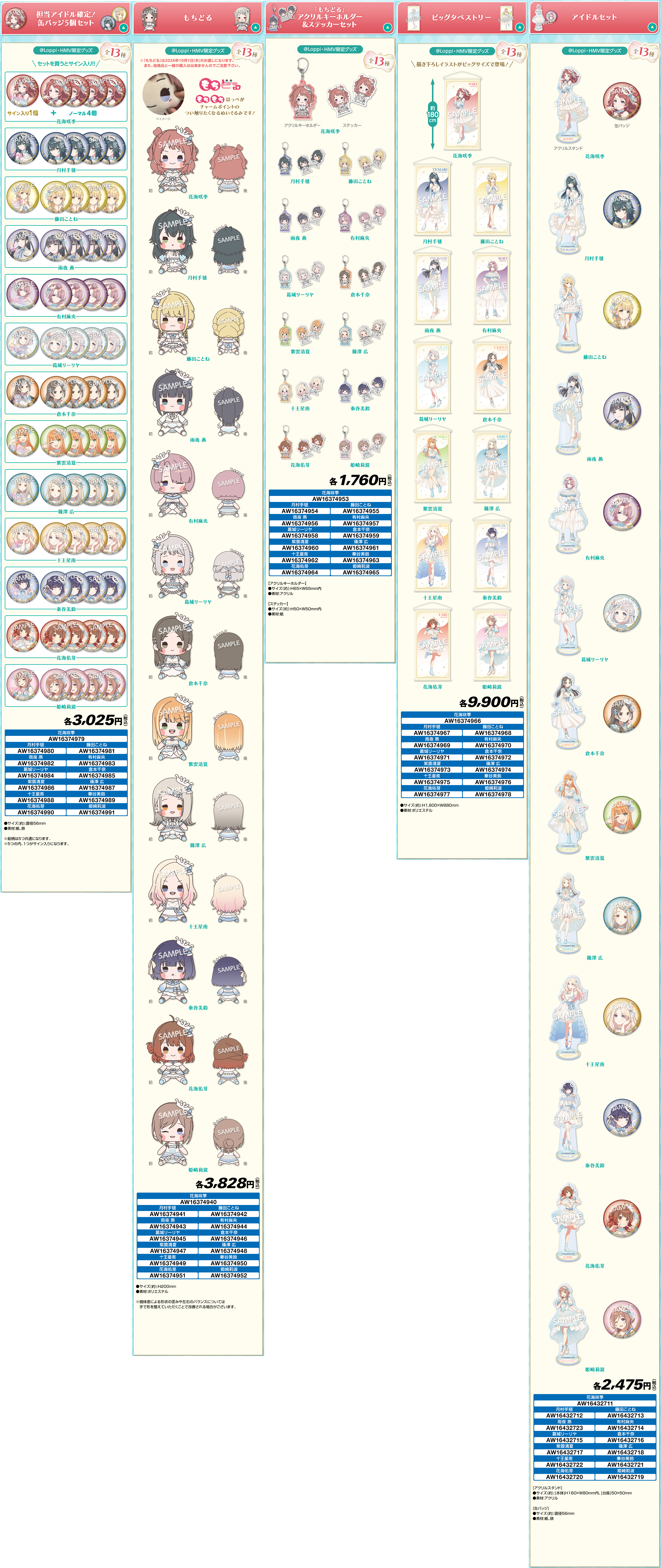- @Loppi・HMV&BOOKS onlineでは「単品ランダム販売」(税込605円)、「担当アイドル確定! 缶バッジ5個セット」(税込3,025円)、「アイドルセット」(税込2,475円)での販売