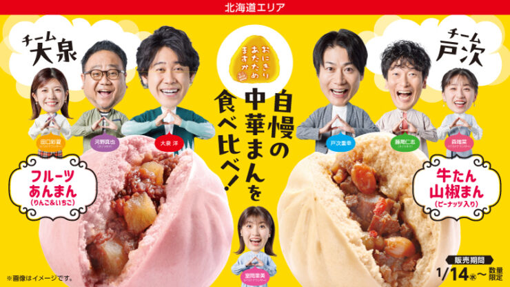 大泉洋チーム考案「フルーツあんまん(リンゴ&いちご)」と戸次重幸チーム考案「牛たん山椒まん(ピーナッツ入り)」が、北海道地区のローソンで2026年1月14日(水)から販売が始まっています。価格は順に329円(税込)、399円(税込)。