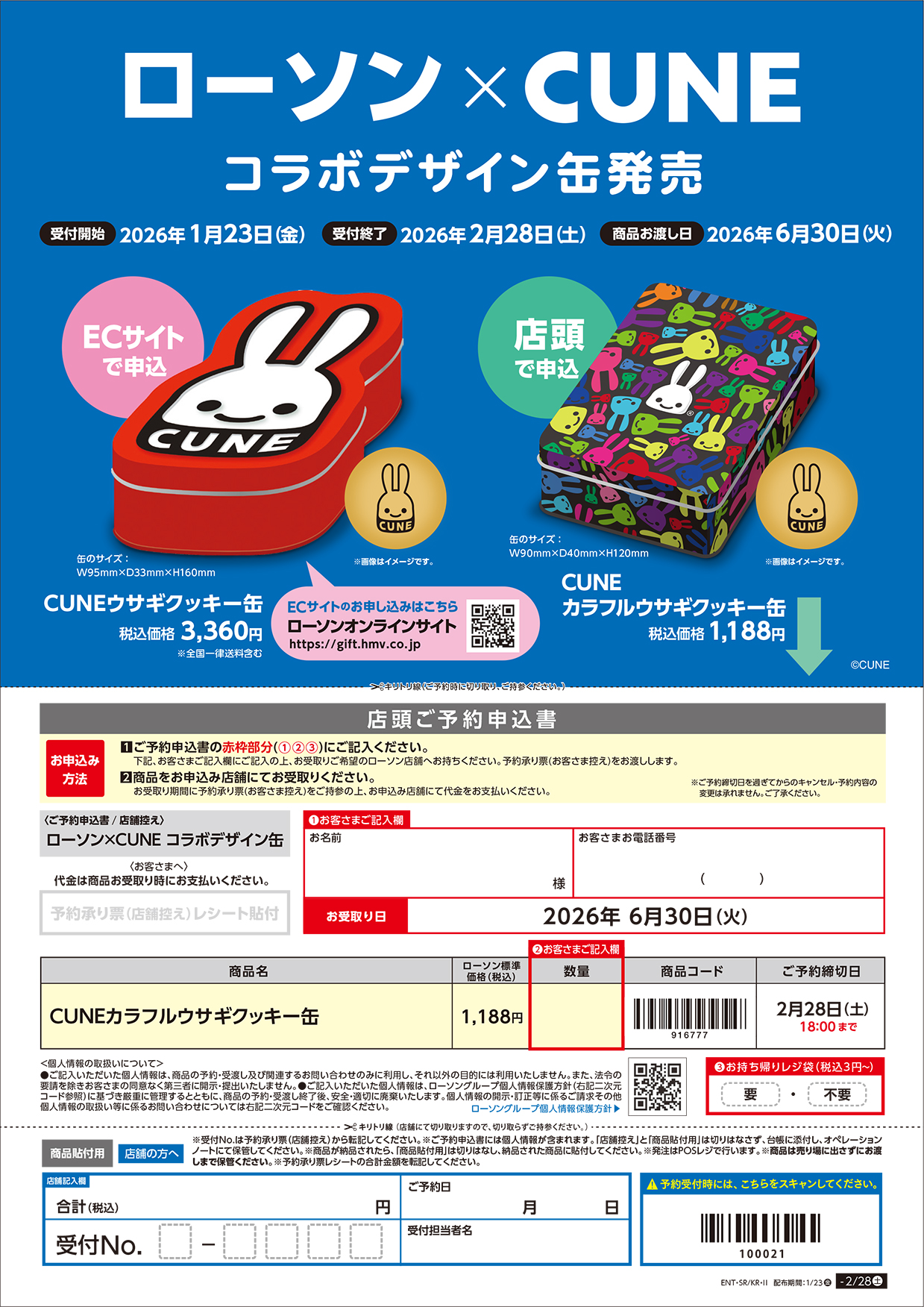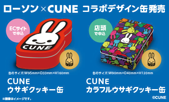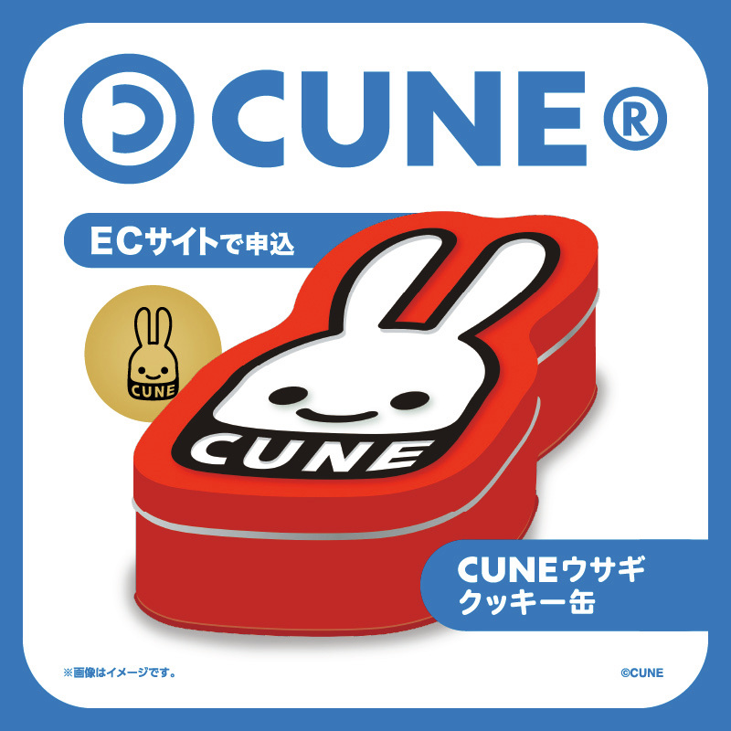店頭予約とオンライン予約で缶のデザインが異なっており、店頭予約では「CUNE カラフルウサギクッキー缶」、オンライン予約では「CUNEウサギクッキー缶」がラインアップ。価格は順に1,188円(税込)、3,360円(税込、送料込)。