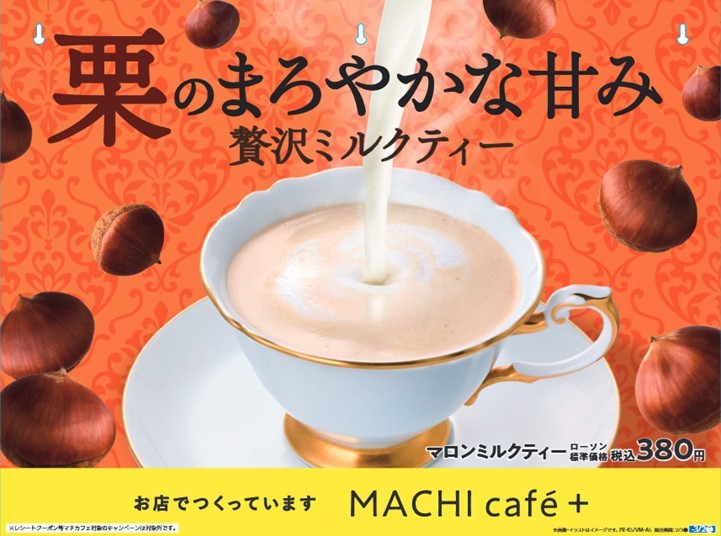 ローソン マチカフェプラス「マロンミルクティー」は、生乳100%のミルクの甘味やコクを活かしたマチカフェオリジナルのミルクティーに、まったりとしたマロンクリームを加えたというもの。