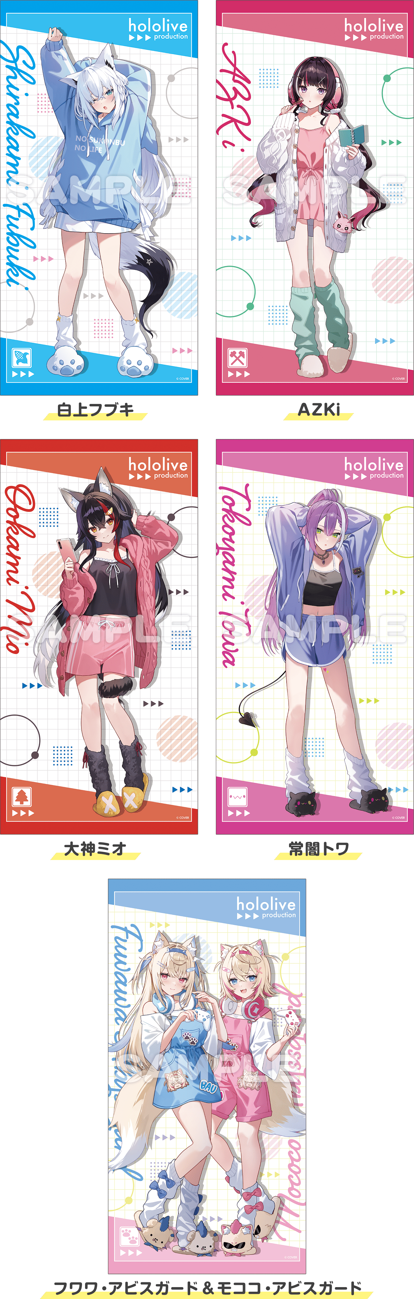 - ラインアップ:【全5種】(白上フブキさん、AZKiさん、大神ミオさん、常闇トワさん、フワワ・アビスガードさん&モココ・アビスガードさん)