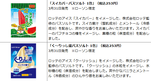 ロッテの人気アイス「スイカバー」「クーリッシュ」をイメージしたというバスソルトがコンビニのローソンで登場。