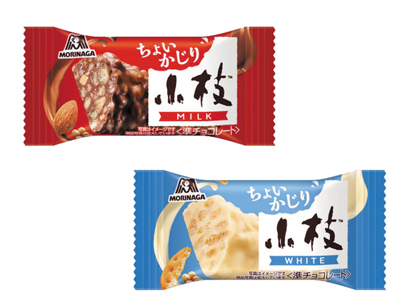 森永製菓「ちょいかじり小枝 ミルク」「ちょいかじり小枝 ホワイト」は、チョコバー(チョコレートバー)タイプの小枝のミニサイズ版。フレーバーはミルクとホワイトの2種類。