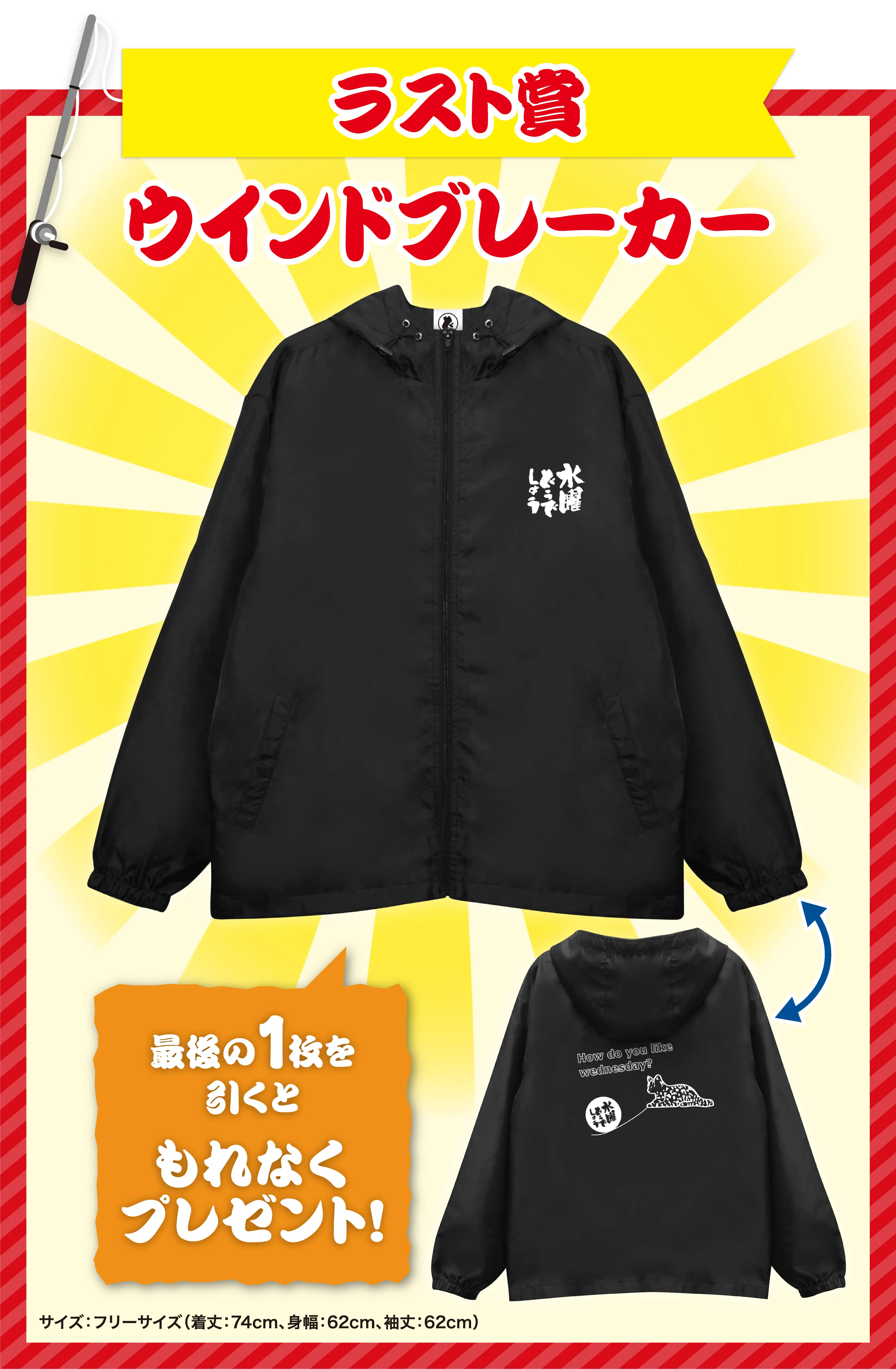 最後の1個を引くと手に入るラスト賞については、番組ロゴを使用したオリジナル「ウインドブレーカー」となっています。
