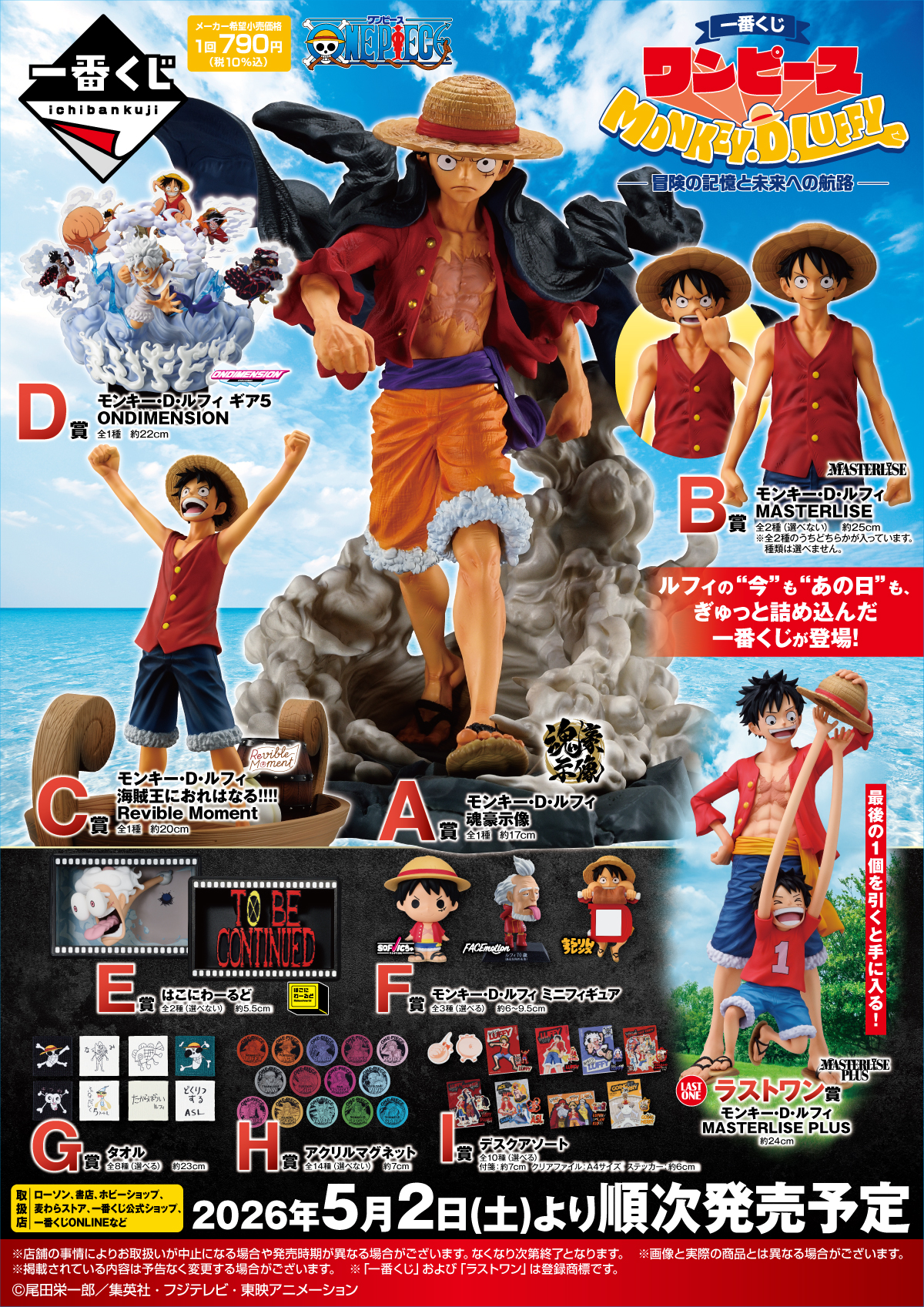 「一番くじ ワンピース MONKEY.D.LUFFY – 冒険の記憶と未来への航路 –」が2026年5月2日(土)から順次販売が開始されます。価格は1回790円(税込)、取り扱い店舗はローソン、書店、ホビーショップ、麦わらストア、一番くじ公式ショップ、一番くじONLINEなど。