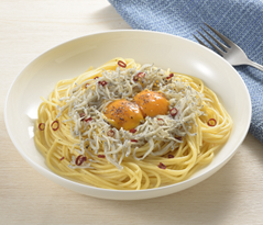 「伊達なしらすのたまぺぺ」は、にんにく・アンチョビの旨味とオリーブオイルの風味が引き立つペペロンチーノに、“伊達なしらす”と卵黄風ソースを乗せたというもの。