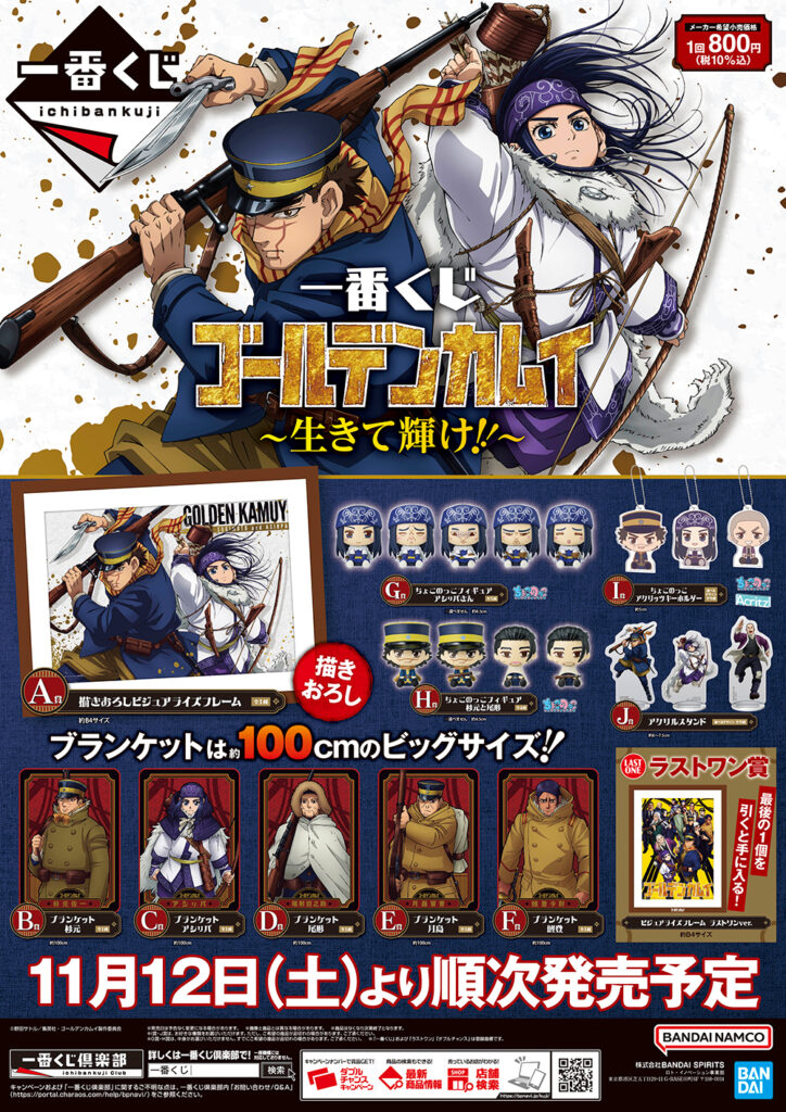 10月よりTVアニメ第4期の放送が始まっている『ゴールデンカムイ』のキャラクターくじに新作が登場、「一番くじ ゴールデンカムイ ~生きて輝け!!~」が11月12日(土)に順次販売が開始されます。価格は1回800円(税込)、取り扱い店舗はローソン、書店、ホビーショップ、一番くじONLINEなど。