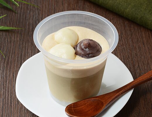 ふわとろ食感のほうじ茶ムースにきな粉クリームを重ね、粒あん、もちもちの白玉を添えた和風スイーツ。
