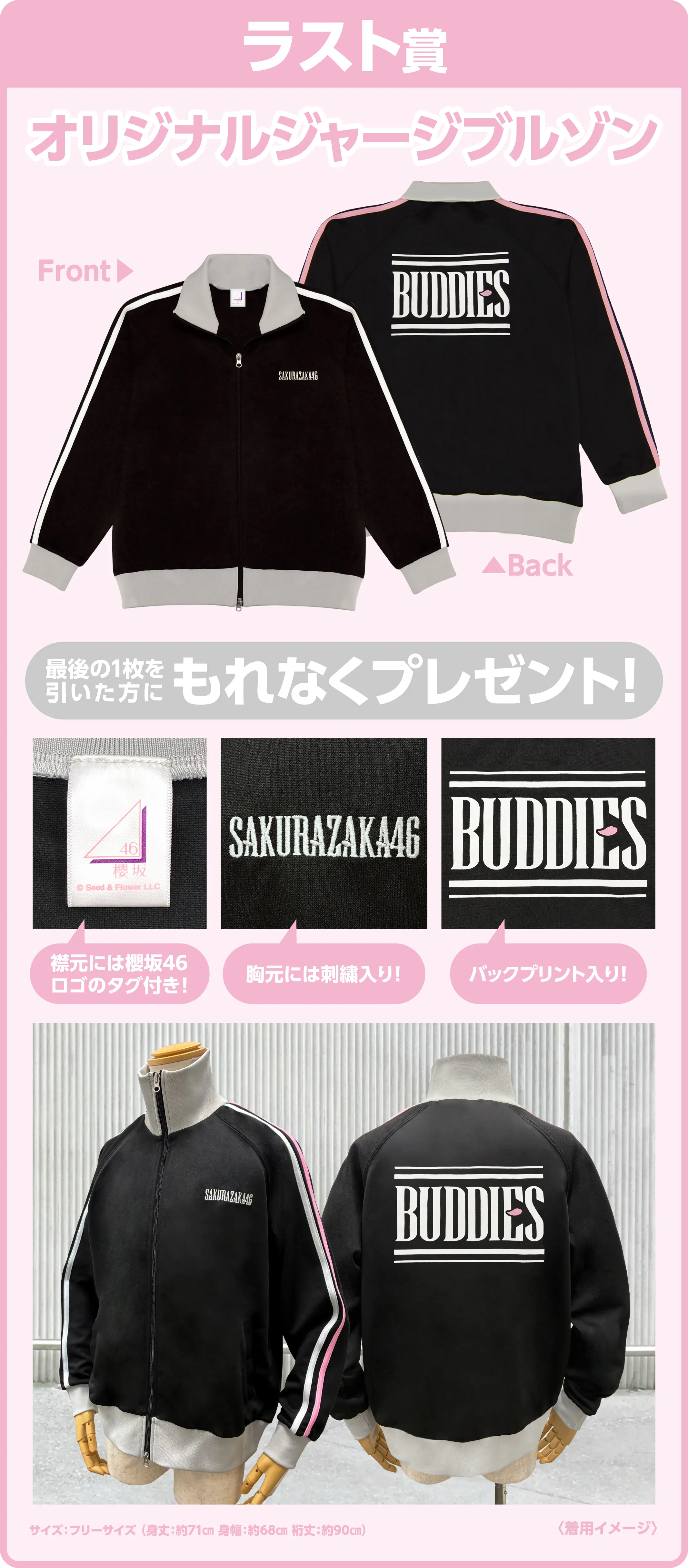最後の1個を引くと手に入るラスト賞については、背中側に“BUDDIES”マークがデザインされた「オリジナルジャージブルゾン」となっています。