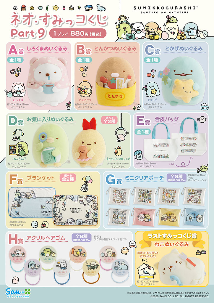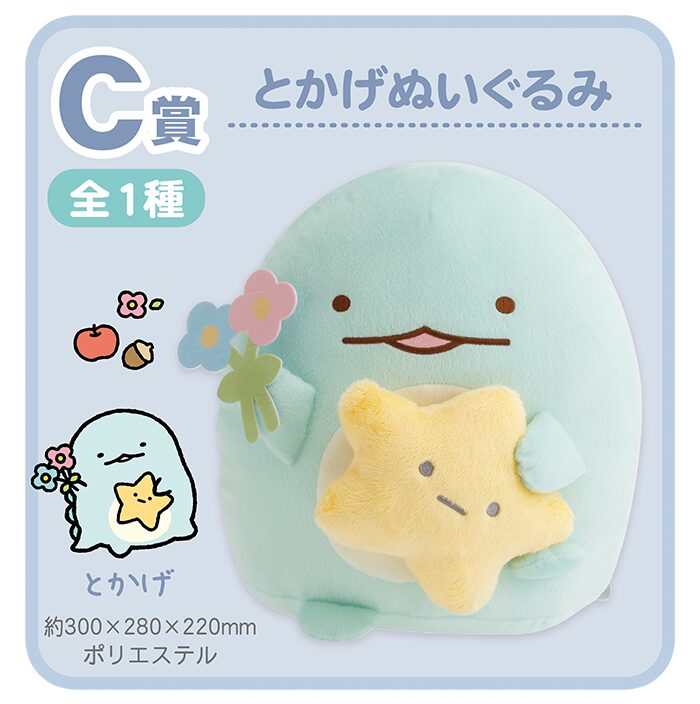 賞品はA賞~H賞とラストすみっコくじ賞が用意され、A賞~C賞はしろくま / とんかつ /とかげの「ぬいぐるみ」、D賞はぺんぎん? もしくは えびふらいのしっぽのどちらかを選べる「お気に入りぬいぐるみ」となっています。