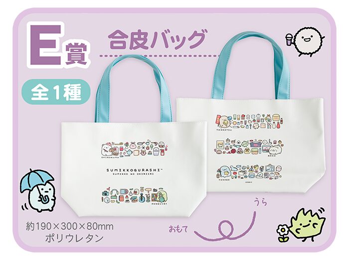 このほか、『すみっコのおきにいり』のイラストをデザインした「E賞 合皮バッグ」「F賞 ブランケット」「G賞 ミニクリアポーチ」「H賞 アクリルヘアゴム」も用意されています。