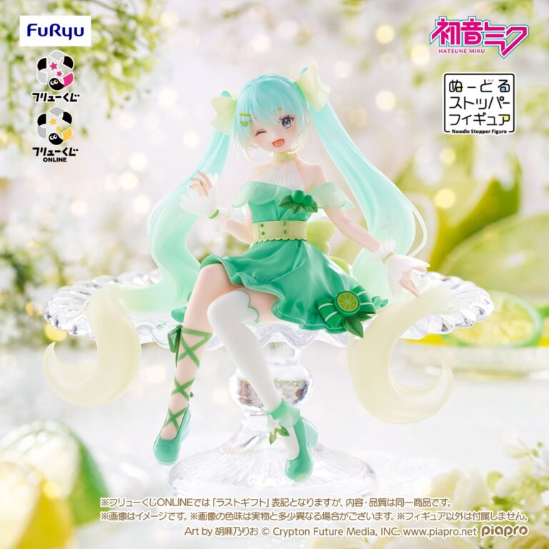 最後の1個を引くと手に入るラストゲット賞については、A賞の『初音ミク ぬーどるストッパーフィギュア』をベースに表情や衣装の色を変更した「初音ミク ぬーどるストッパーフィギュア – ライムver. –」となっています。