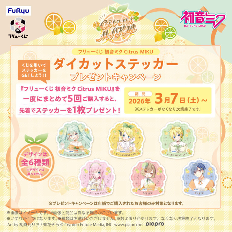 「フリューくじ 初音ミク Citrus MIKU」を一度の会計で5回購入すると、今回のくじビジュアルを使用した「ダイカットステッカー」(全6種/ランダム)を1枚もらえるそうです。