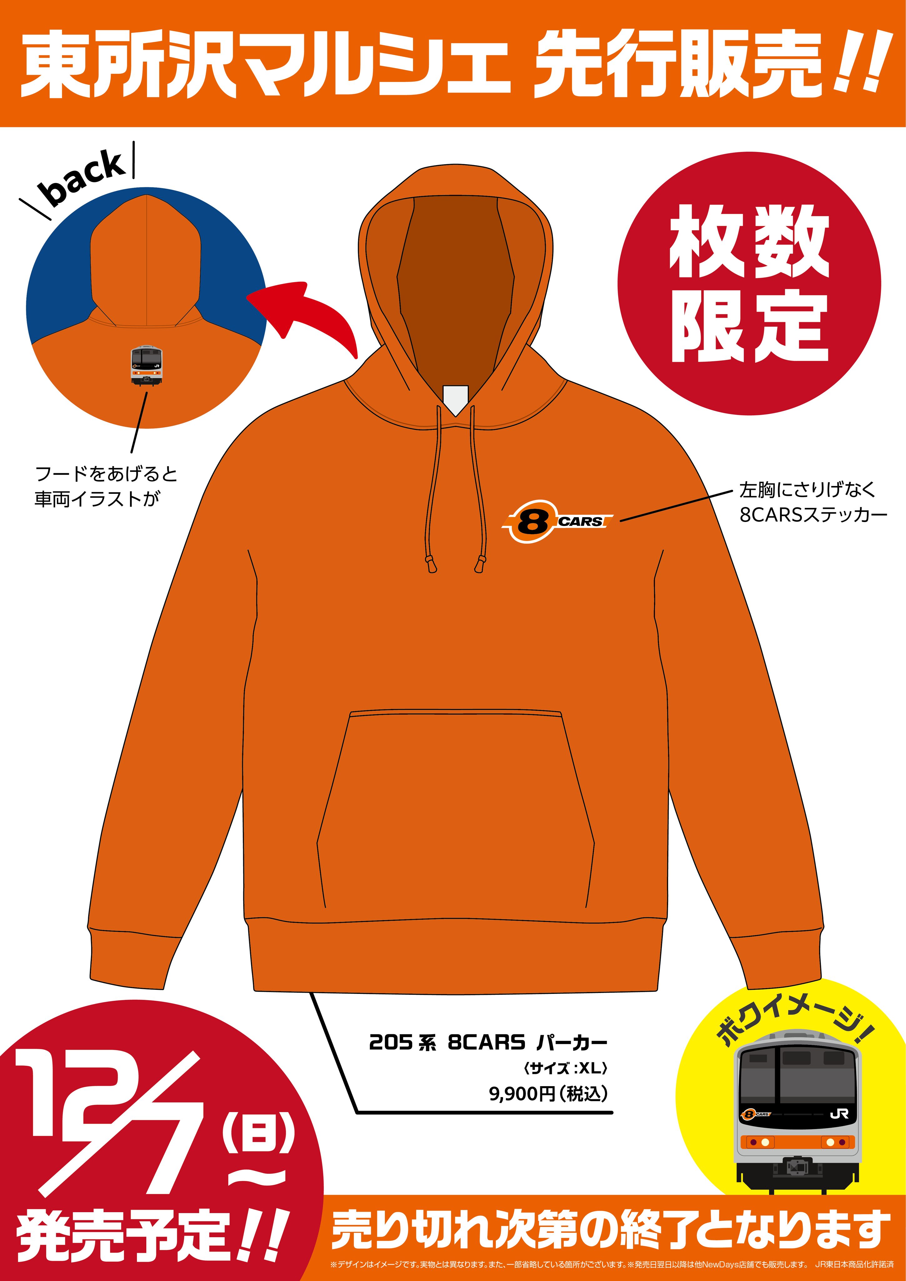 また、上記のグッズに加えて、東所沢マルシェでは「205系 8CARS パーカー」(税込9,900円)が12月7日(日)に先行販売されるそうです。