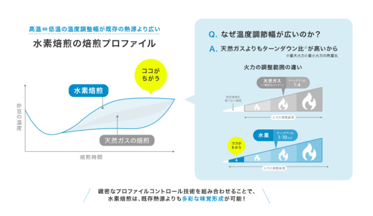 水素焙煎では低い温度帯でも安定的に火力を調整可能であることを活かし、弱火も使ってじっくりと焙煎することで、雑味が少なく、澄んでいながらも飲みごたえがある味と、フルーティーでまろやかな酸味を楽しめるとのこと。