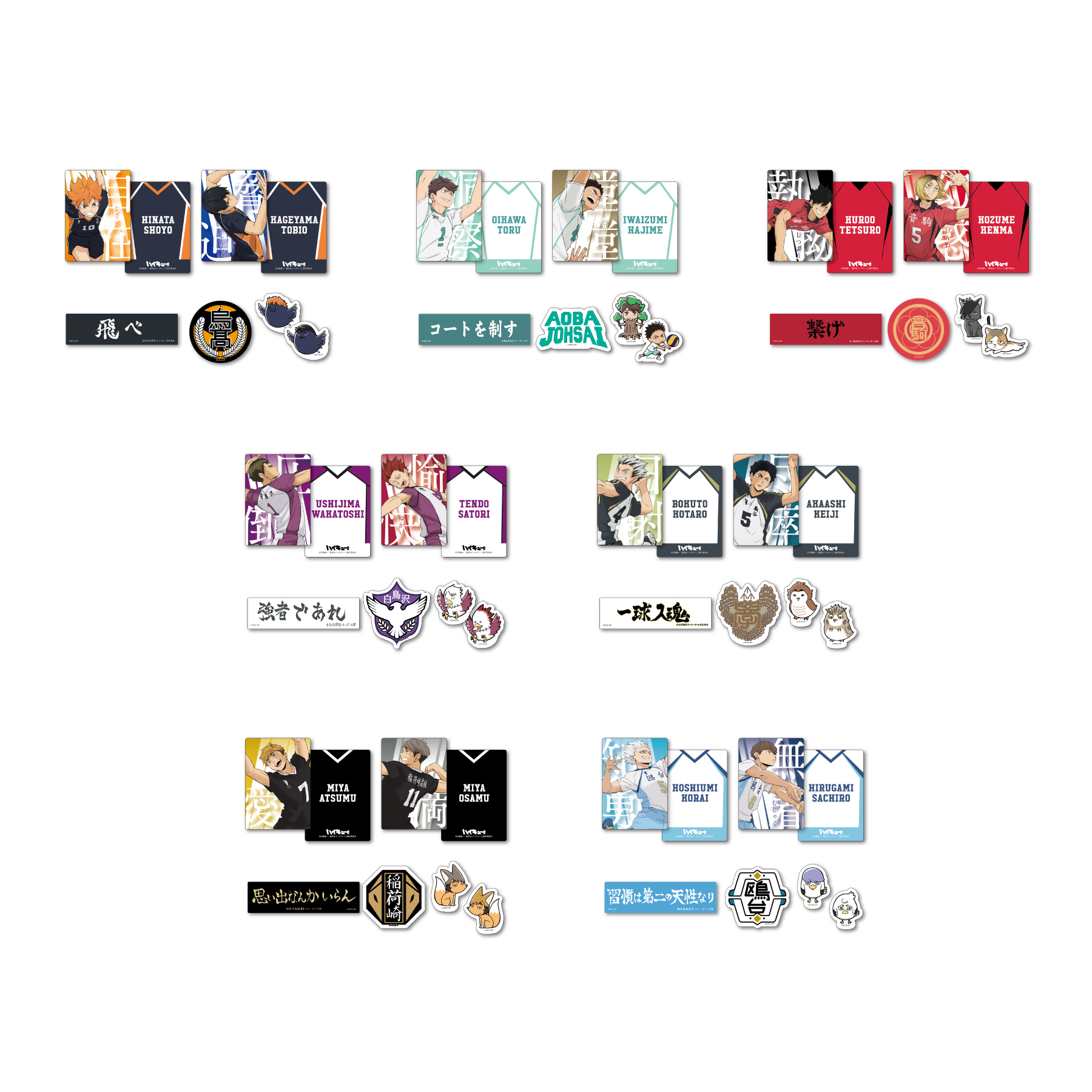 さらに、各高校の横断幕やスターティングローテーションをデザインした「H賞 横断幕フラットポーチ」、アニメ『ハイキュー!!』の10th ANNIVERSARY 繋ぐProjectのビジュアルを使用した「I賞 “繋ぐ”アクリルキーホルダー」、各校でお馴染みのキャラクターがセットになった「J賞 コンビ缶バッジセット」、キャラクターやアニマルマスコットなどをデザインした「K賞 ステッカー&カードセット」もラインアップされています。