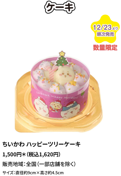 なお、セブンイレブンではちいかわのクリスマスケーキ「ちいかわ 夢みるわくわくクリスマス」が12月8日(月)時点でも予約受け付けが実施されており、上記「ちいかわ ハッピーツリーケーキ」より小さいサイズ(夢みるは4号サイズ)&低価格&異なるデザインとなっています。