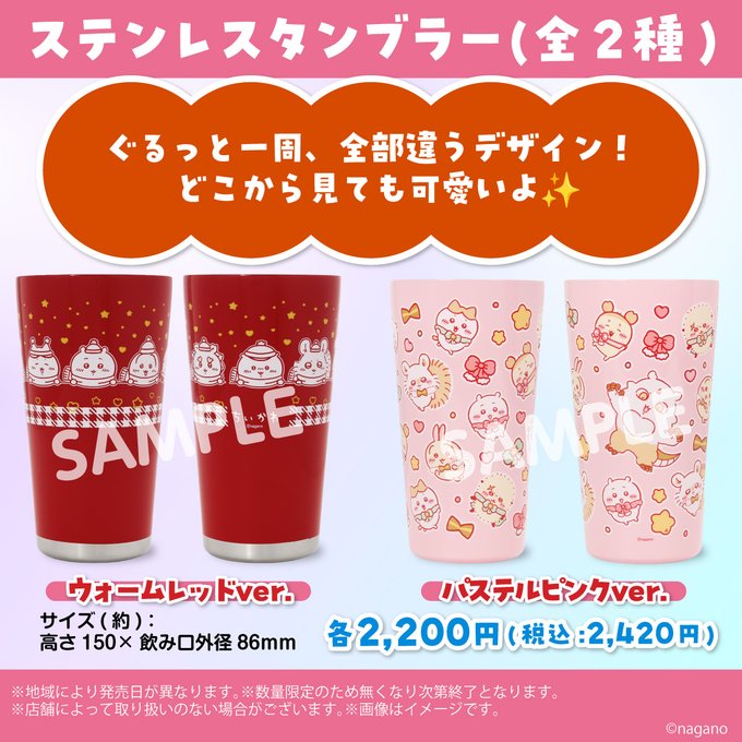 第2弾では「ちいかわステンレスタンブラー パステルピンクver.」と「ちいかわステンレスタンブラー ウォームレッドver.」の2種類がラインアップされ、価格は各2,420円(税込)。