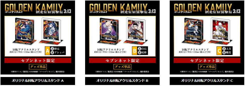 回転アクリルスタンドは「Aタイプ(表:杉元 / 裏:アシㇼパ)」、「Bタイプ(表:白石 / 裏:尾形)」、「Cタイプ(表:土方 / 裏:鶴見)」の3種類がラインアップされ、好きなタイプを選んで購入可能。アクスタの組み立て時のサイズ(約)はH112×W95×D32mm。