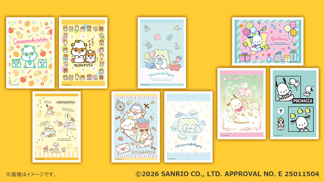 2月に誕生日を迎える「ポチャッコ」「まるもふびより」「コロコロクリリン」の3キャラクターが登場し、各3種類ずつラインアップ。全9種の中から好きな1枚を選んで購入できます。
