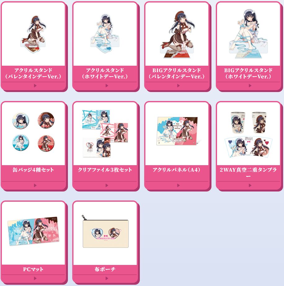 今回、セブンネットショッピングで予約販売は始まった僕ヤバグッズは、バレンタイン&ホワイトデーをイメージした、山田杏奈の描き下ろしイラストを使用した「アクリルスタンド」「2WAY真空二重タンブラー」「PCマット」など全8商品。
