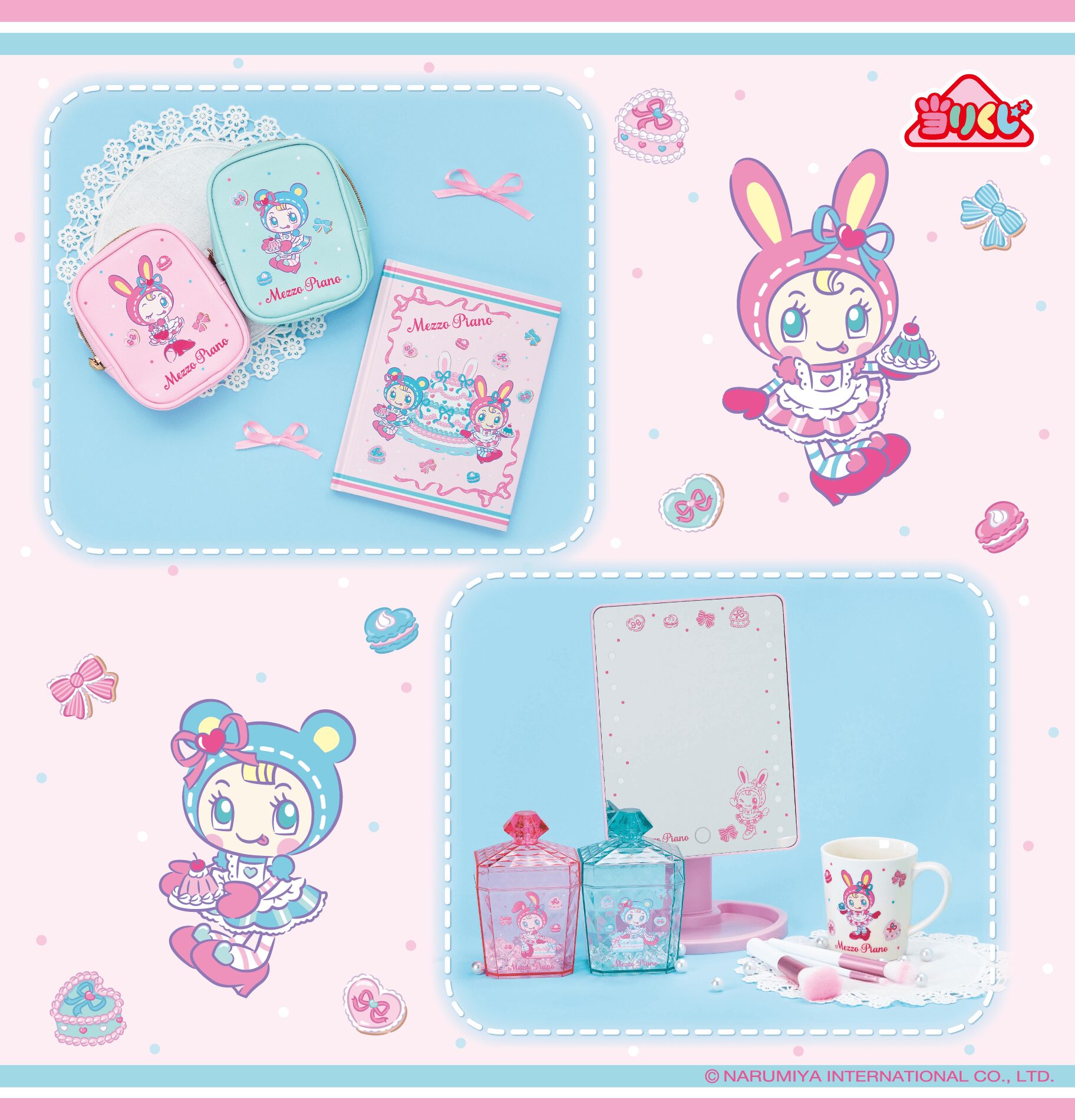 上段左から「ポーチ」(ピンク / ブルー)、「ノート」、下段左から「小物入れ」(ピンク / ブルー )、「ミラー」、「マグカップ」