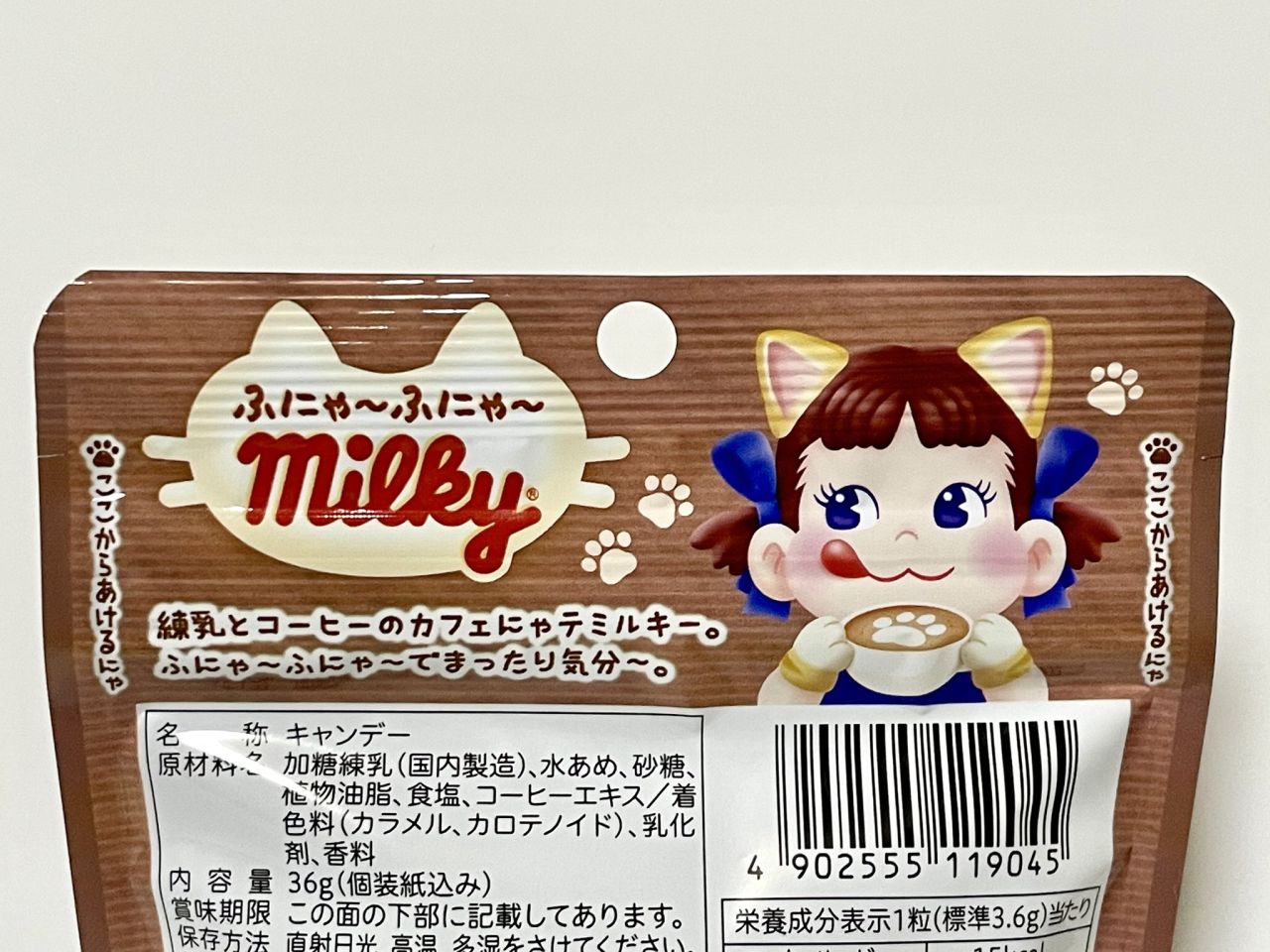 「不二家 ふにゃ~ふにゃ~ ミルキー カフェにゃテ」は、練乳とコーヒーの味わいを楽しめる、やわらか食感の不二家ミルキー。