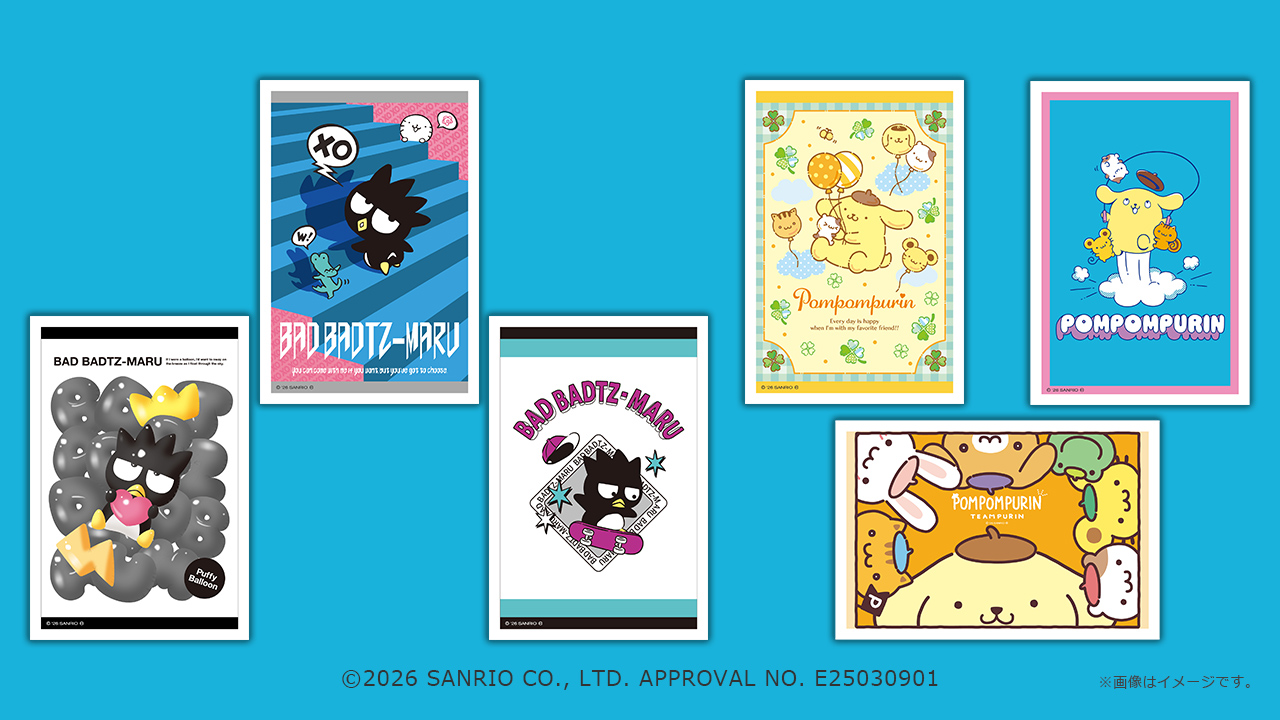4月に誕生日を迎える「バッドばつ丸」「ポムポムプリン」の2キャラクターが登場し、各3種類ずつラインアップ。全6種の中から好きな1枚を選んで購入できます。