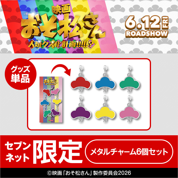 今回、予約販売が始まるムビチケ前売り券は、映画『おそ松さん 人類クズ化計画!!!!!?』の「ムビチケ前売券(カード)」とセブンネット限定グッズ「メタルチャーム6個セット」がセットになったもの。