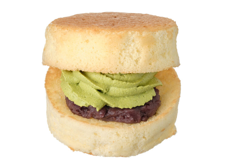 厚焼きのふわふわとしたどら焼生地で、つぶあんと抹茶ホイップクリームを挟んだ商品です。