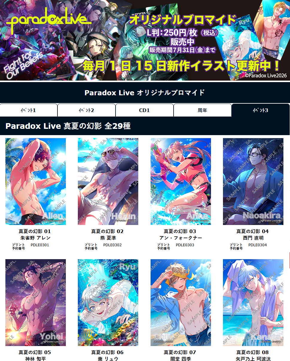 「Paradox Live 真夏の幻影」のビジュアルを基にしたブロマイドで、全29種類がラインアップ。