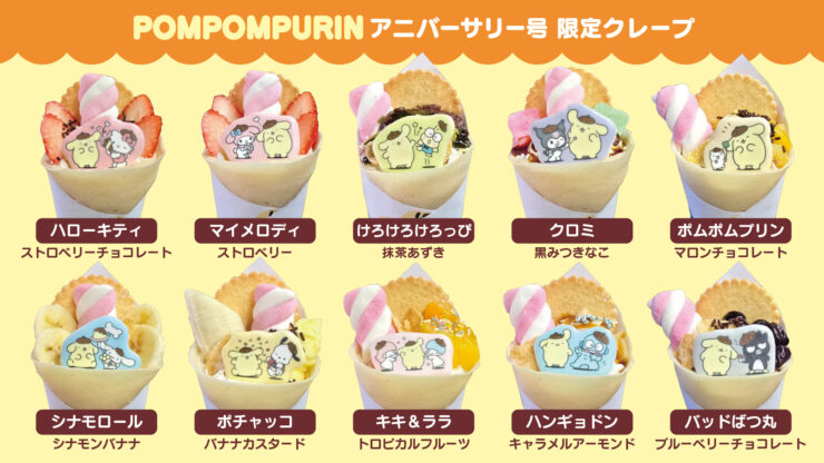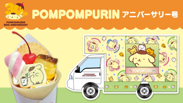今回、ポムポムプリン30周年を記念した特別デザイン号「ポムポムプリンアニバーサリー号」がイトーヨーカドー国領店に期間限定で出店され、「ポムポムプリン アニバーサリークレープ」(ノベルティシール付き)やサンリオキャラクタークレープ、キティの焼きドーナツなどが販売されます。