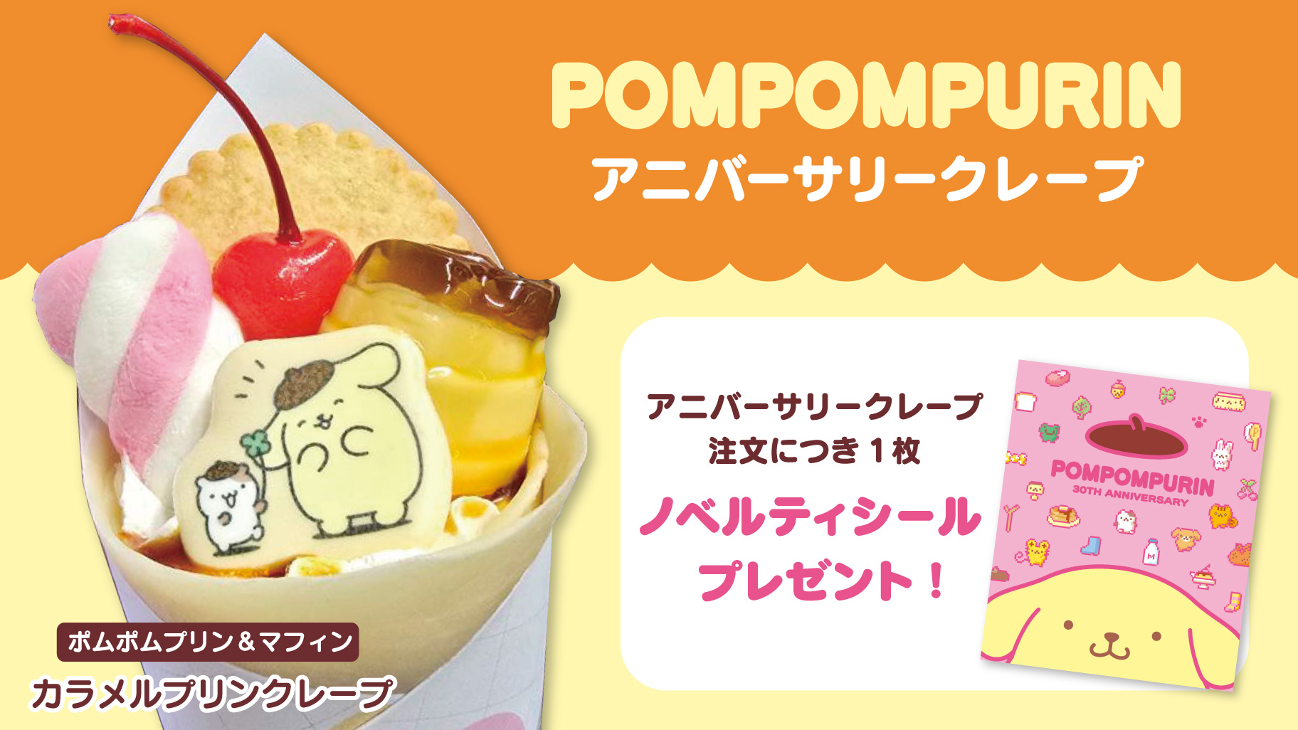 今回、ポムポムプリン30周年を記念した特別デザイン号「ポムポムプリンアニバーサリー号」がイトーヨーカドー国領店に期間限定で出店され、「ポムポムプリン アニバーサリークレープ」(ノベルティシール付き)やサンリオキャラクタークレープ、キティの焼きドーナツなどが販売されます。