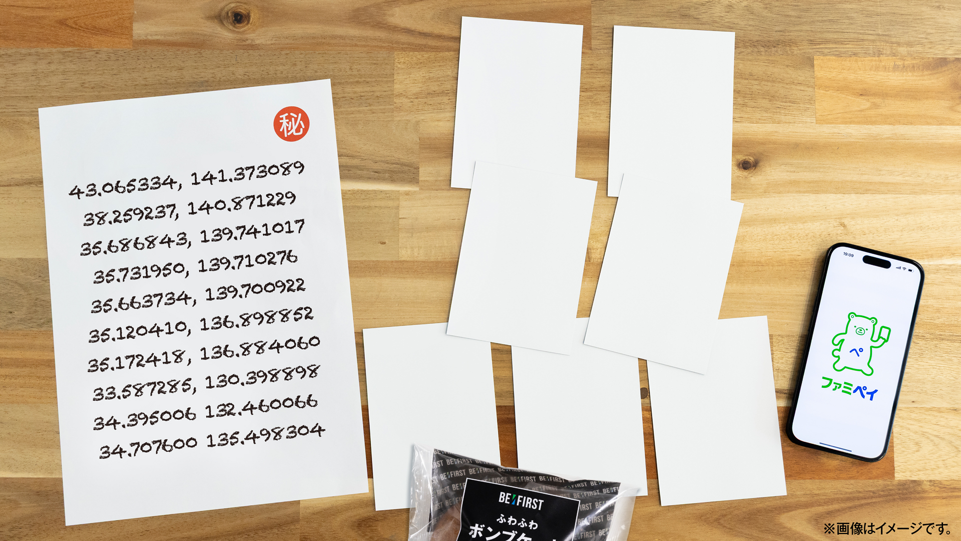 ファミマ公式の投稿では、緯度・経度と見られる数字が書かれた「マル秘」用紙と共に、「BE:FIRST ふわふわボンブケ」(ボンブケーキ?)と確認できるアイテムが登場。