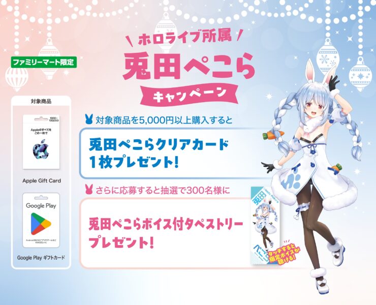 なお、今回のキャンペーンにはファミリーマートでApple Gift Card / Google Play ギフトカードを5,000円(税込)以上購入すると参加でき、対象商品購入で兎田ぺこらさんのクリアカードを1枚もらえます。