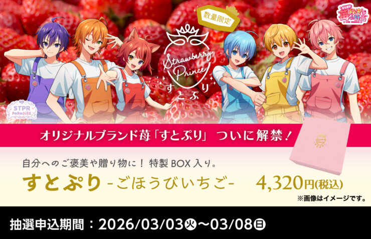 なお、「すとぷり – ごほうびいちご -(特製BOX入り)」はSTPR ONLINE STOREで2026年1月15日(木) ~ 2月8日(日)の期間に予約販売されたことがあります。