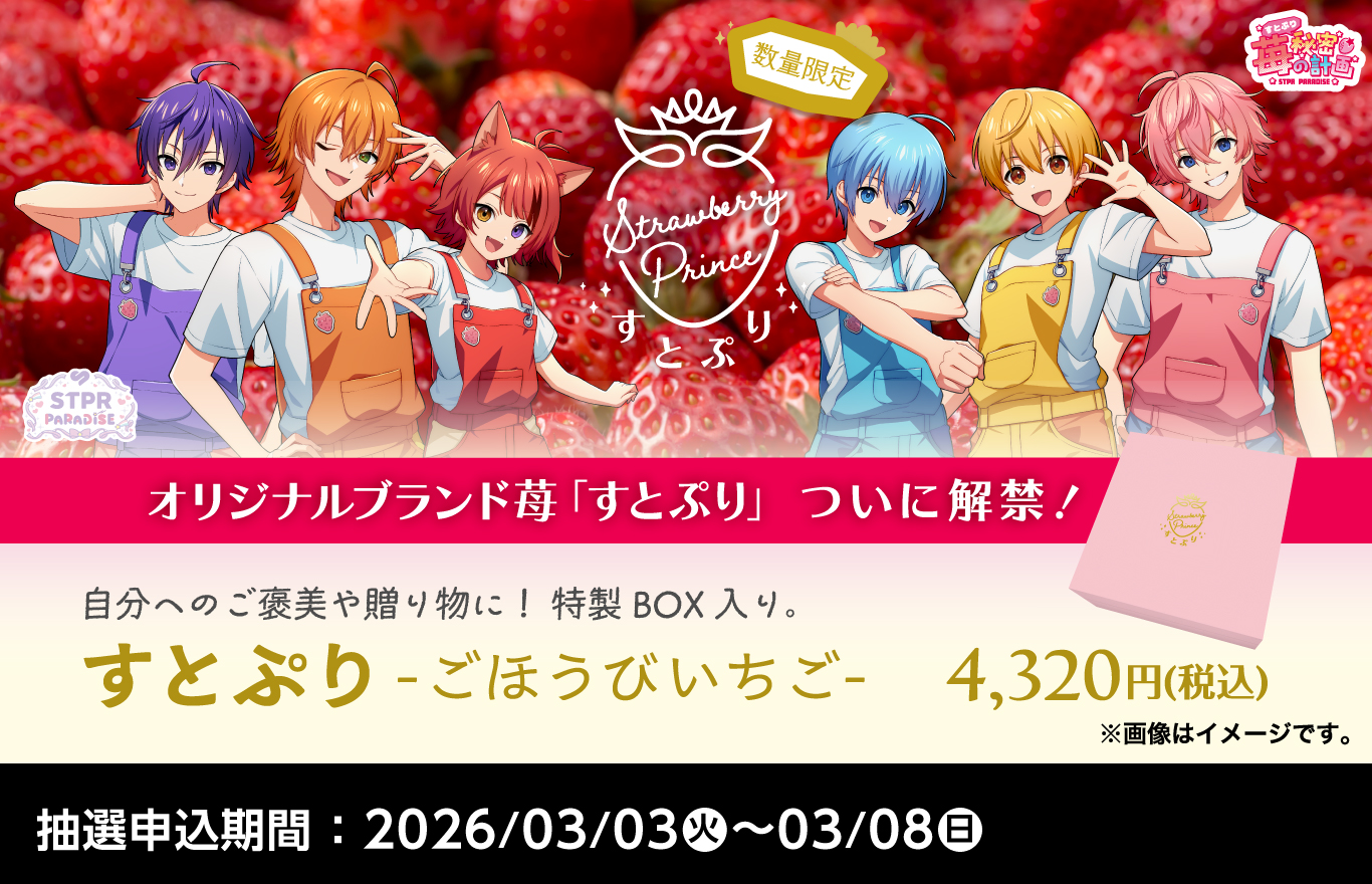 エンタメユニット「すとぷり」(すとろべりーぷりんす)の楽曲を聴かせて栽培されたオリジナルブランド苺『すとぷり』がファミリーマートのECサイトで抽選販売が決定、2026年3月3日(火) ~ 3月8日(日)までの期間に受け付けが実施されています。