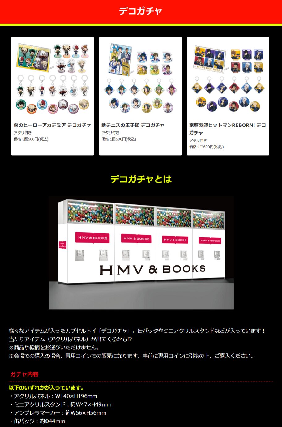 『僕のヒーローアカデミア』、『新テニスの王子様』、『家庭教師ヒットマンREBORN!』のデコガチャがラインアップされ、「アクリルパネル」「ミニアクリルスタンド」「アンブレラマーカー」「缶バッジ」のいずれかが当たります。