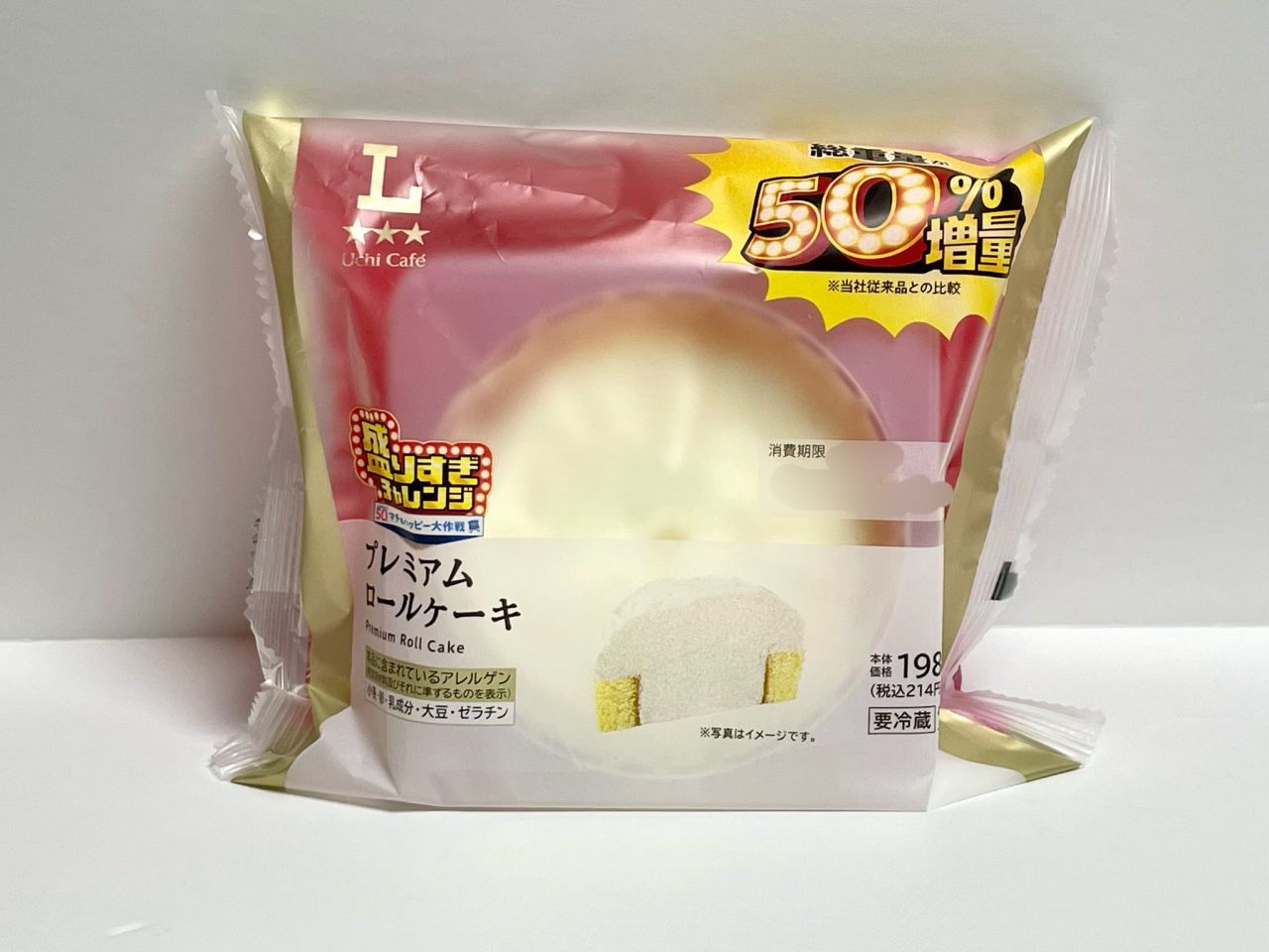 「Uchi café 盛りすぎ! プレミアムロールケーキ」は、現行の「プレミアムロールケーキ」と比較して、価格はそのままに総重量が約50%増量したスイーツ。