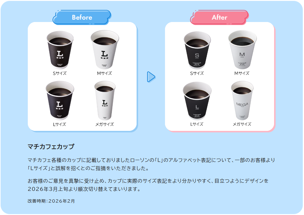 3つ星ローソン『L』のロゴがサイズ表記と間違えやすかったのを修正、カップのサイズ表記を目立つデザインに