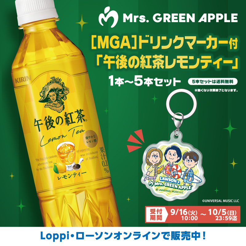 同イベントにコンビニのローソンがブースを出店し、Mrs.GREEN APPLEとコラボした「MGAドリンクマーカー付き 午後の紅茶 レモンティー」を当日販売するそうです。価格は500円(税込)。 販売数には限りがあり、無くなり次第終了となるそうです。