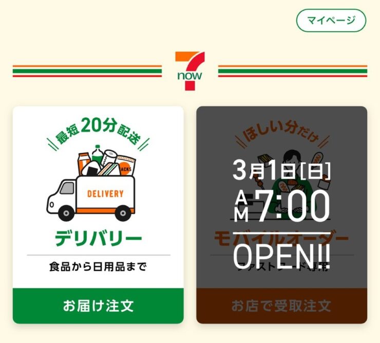 セブンイレブンのデリバリーサービス「7NOW(セブンナウ)」でモバイルオーダー機能が近日実装、2026年3月1日(日) 7:00からスタートするようです。