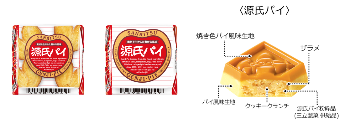 商品は焼き色パイ風味生地とパイ風味生地の2層仕立てで、パイ風味生地の中には「源氏パイ粉砕品(三立製菓 供給品)」、「クッキークランチ」、「ザラメ」が入っており、サクッと香ばしい味わいを楽しめるとされています。