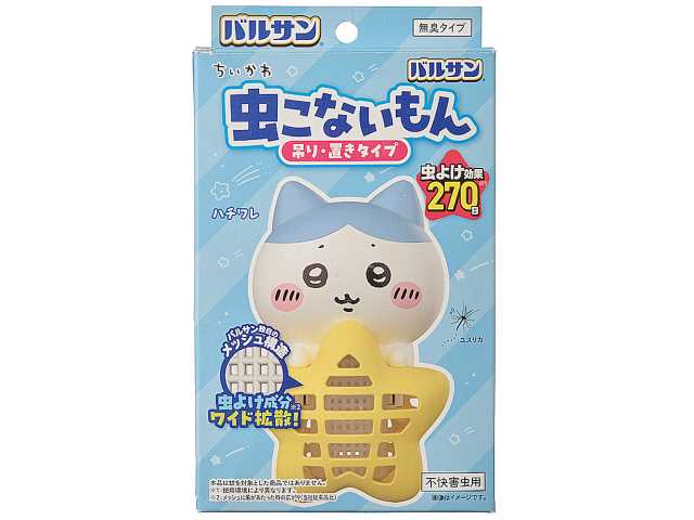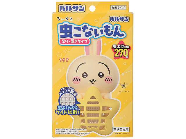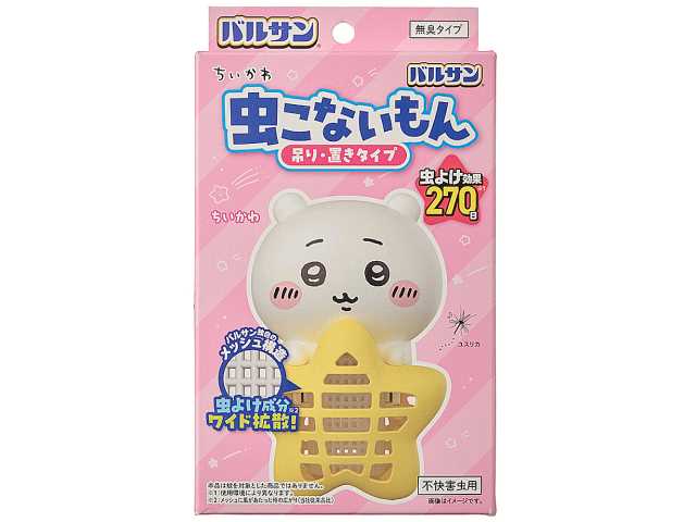 「バルサン ちいかわ むしこないもん」は、ちいかわ / ハチワレ / うさぎを吊ったり置いたりすることで、いやな虫が近づきにくくできる殺虫・忌避アイテム。