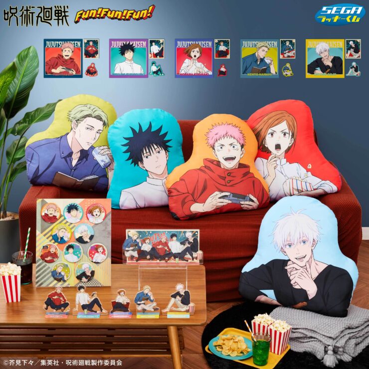 ローソンなどで「セガ ラッキーくじ『呪術廻戦 Fun!Fun!Fun!』」が2025年12月26日発売、ゲームやポップコーンを楽しむ虎杖悠仁 / 伏黒恵 / 釘崎野薔薇 / 七海建人 / 五条悟が登場。“ダイカットクッション”や“アクスタ”が当たる!