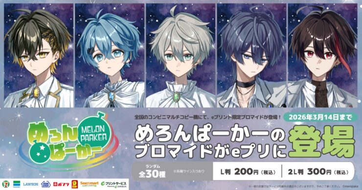 歌い手グループ「めろんぱーかー」オフィシャルブロマイド第5弾がコンビニで2026年2月15日発売、楽曲『遊藍飛行』のビジュアルなど全30種が登場。りゆにおんツアーの「未公開実写ブロマイド」もあり。低確率でサイン入りが出力