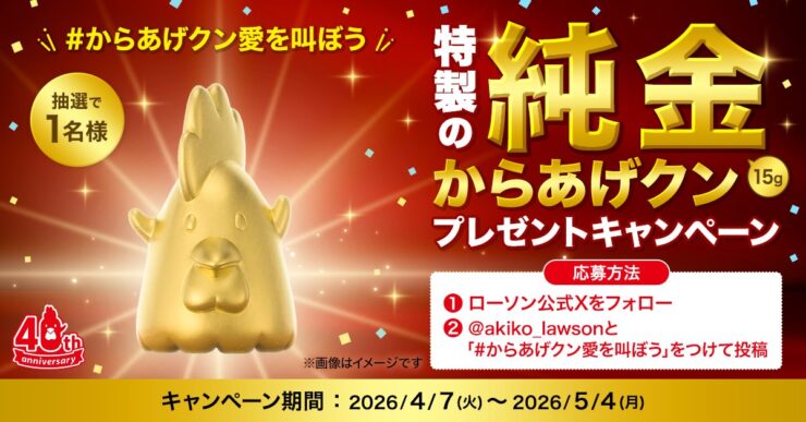 「特製の純金からあげクン」が当たる! ローソンのX(旧Twitter)でフォロー&からあげクン愛を叫ぼうキャンペーンが2026年4月7日からスタート。応募期間は5月4日まで