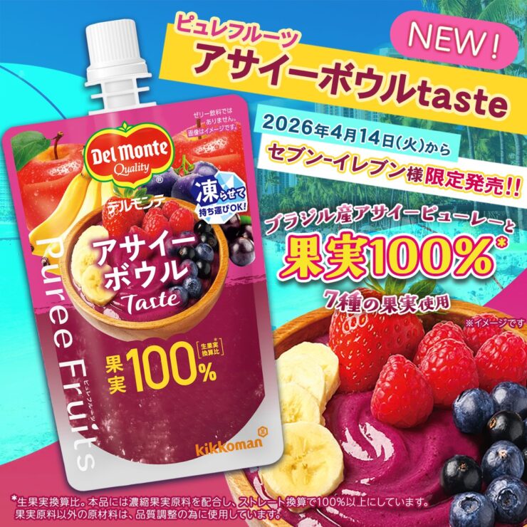 セブンイレブン限定「デルモンテ ピュレフルーツ アサイーボウルテイスト」が2026年4月14日発売、ワンハンドで手軽に飲めるアサイーボウル。凍らせて持ち運びもOK