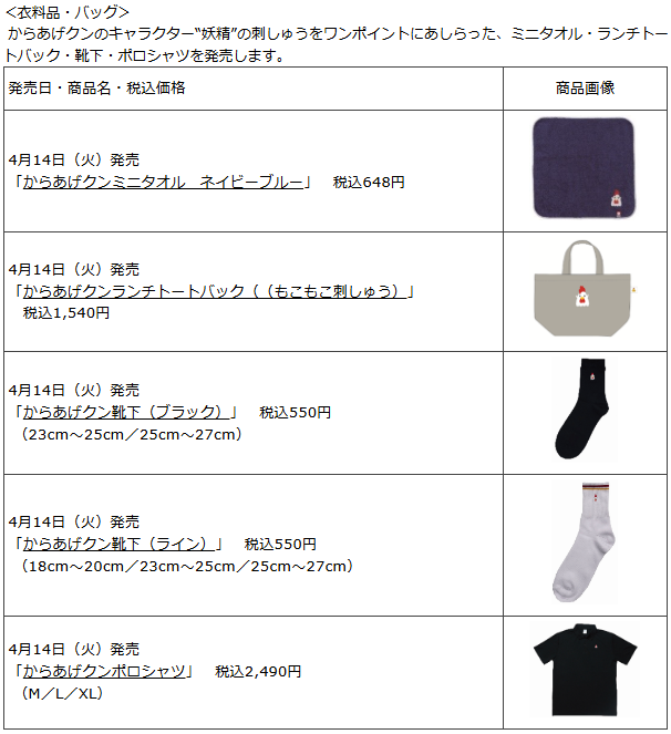 ローソンで「からあげクン」新作グッズが2026年4月14日店頭発売、ミニタオル / ランチトートバック(もこもこ刺繍) / 靴下 / ポロシャツが登場。からあげクンの妖精がワンポイント!